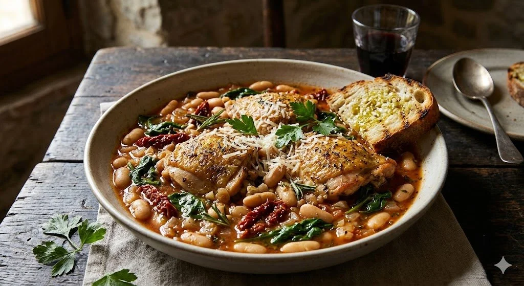 White beans are the secret weapon of budget cooking. They're cheap, they're high in protein AND fiber, and they absorb whatever flavors you cook them in. Combined with canned tomatoes, spinach, and thin-sliced chicken, this skillet tastes like something that simmered for hours — but it's ready in 25 minutes. This one disappears fast.